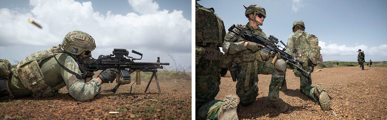 Links een schutter die met een 5.56 mm Minimi mitrailleur een salvo afgeeft en rechts militairen knielend gefotografeerd op de schietbaan.