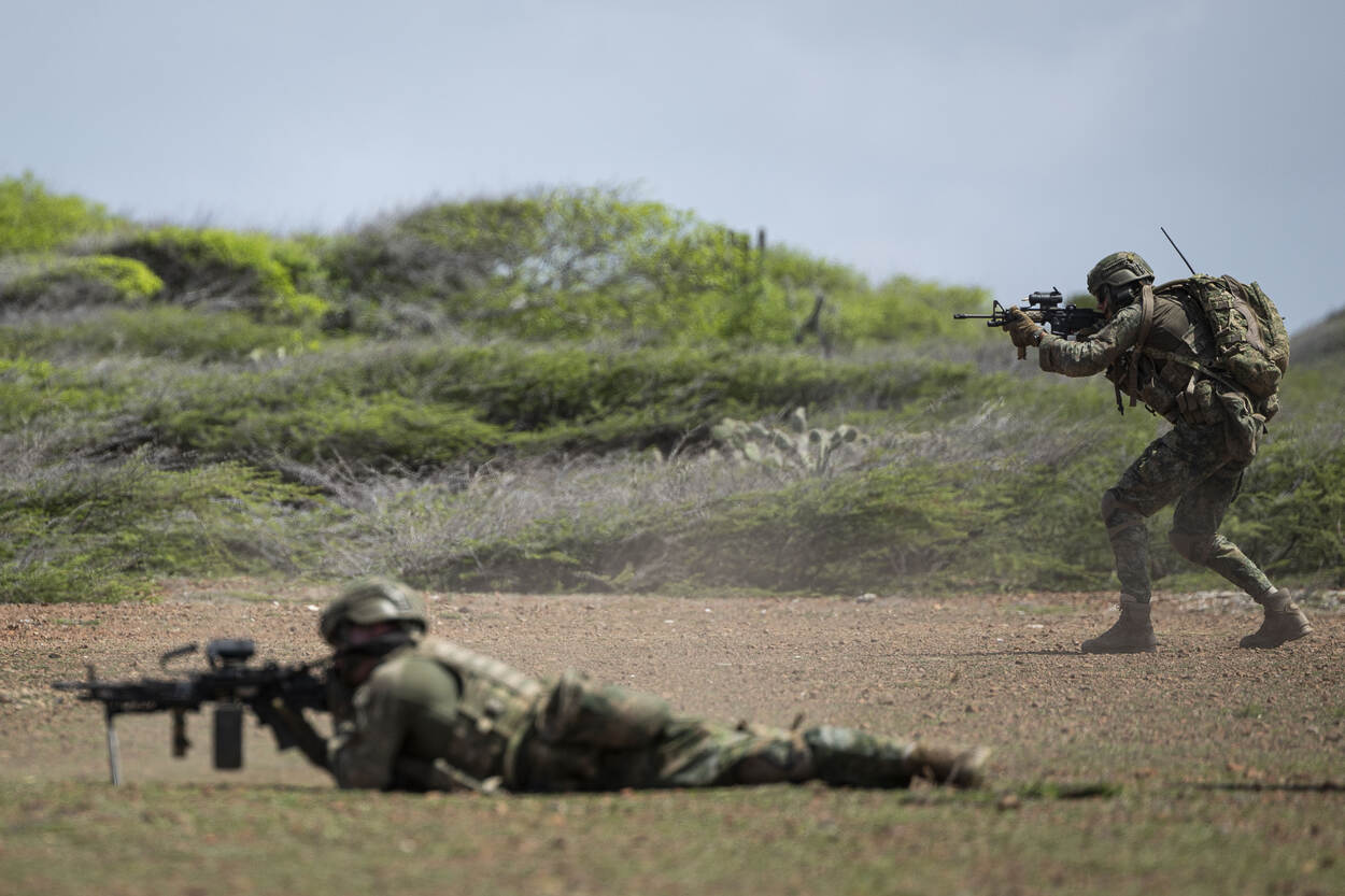 Dat de nieuwe infanteristen aansluitend in de Algemene Militaire Opleiding Luchtmobiel overzee worden ingezet, verdient volgens de hoogste baas een plaatsje in de geschiedenisboeken. Nog niet eerder gebeurde dat. Op Curaçao werken de mannen verder op tot pelotonsniveau. Op oefenterrein Wacawa, in samenwerking met de meer ervaren collega’s. Ze verfijnen er hun contact drills en het optreden in verstedelijkt gebied. Ook voeren ze tactische live firings uit. “Minstens zo belangrijk is dat iedereen elkaar nog beter leert kennen”, vindt Bernhard. “Voor het eerst in een jaar heb ik hier de hele compagnie bij elkaar.”