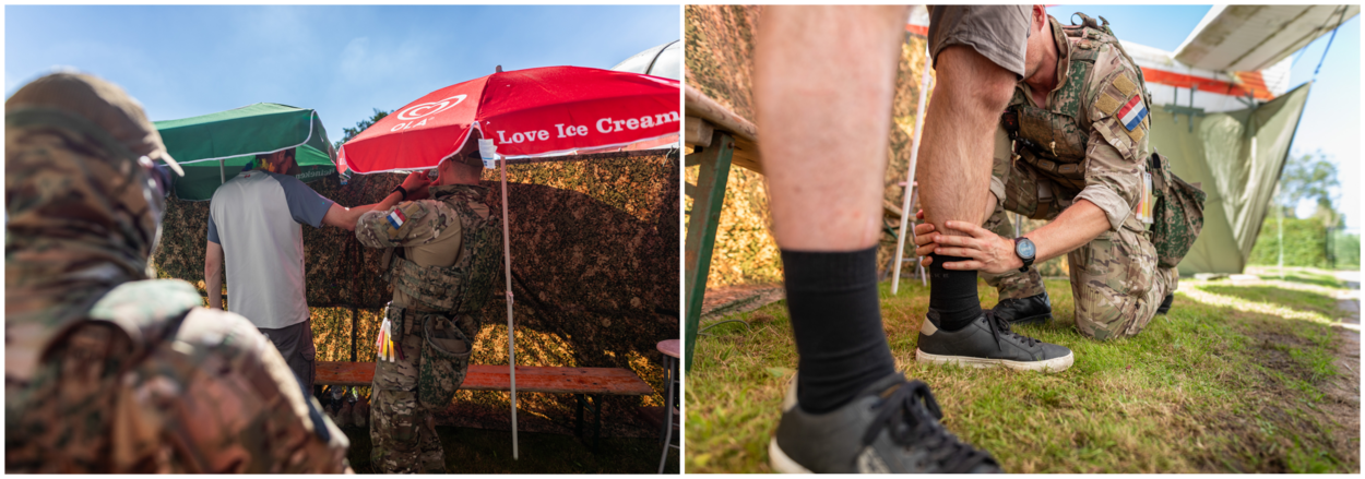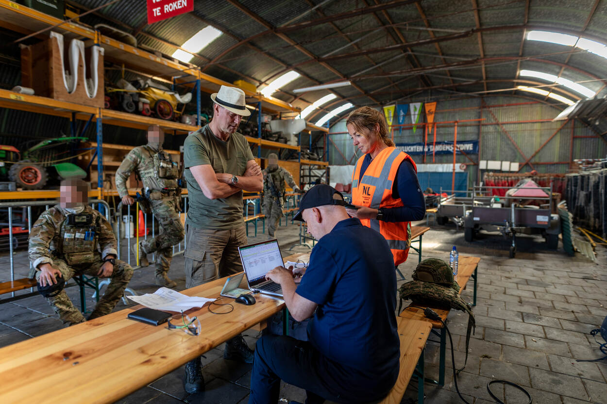 Als de commando’s op de grond het sein ‘veilig’ hebben gegeven, landt het toestel. Het is duidelijk dat iedereen precies weet wat-ie moet doen. Eerst krijgen de hangars op het terrein een veiligheidscheck. Bovendien kijken de Rangers of er bruikbare spullen zijn te vinden om de aankomst van de evacués zo soepel mogelijk te laten verlopen. Hekken, bankjes, lint: alles wat los zit mogen ze gebruiken van directeur Van der Meulen. De korporaals Jordy en Gino beginnen direct spullen te verslepen, zoals stoelen en parasols. “De mensen die we straks opvangen moeten wel comfortabel kunnen zitten. Dus netjes op een rij en in de schaduw”, zegt korporaal 1 ‘Nellie’.