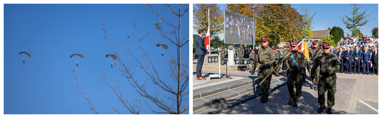 De ceremonie wordt geopend met een sprong van 8 parachutisten die boven het plein zweven. Een passend eerbetoon aan de gesneuvelde kameraden. Daarna zijn er speeches van premier Dick Schoof, de voorzitter Stichting Driel-Polen Arno Baltussen en de burgemeester van de gemeente Overbetuwe, Patricia Hoytink-Roubos. De sprekers staan stil bij de onrustige tijd waarin we nu leven, maar in sommige speeches is ook een oproep te horen voor eerherstel van de 1e Onafhankelijke Parachutistenbrigade.