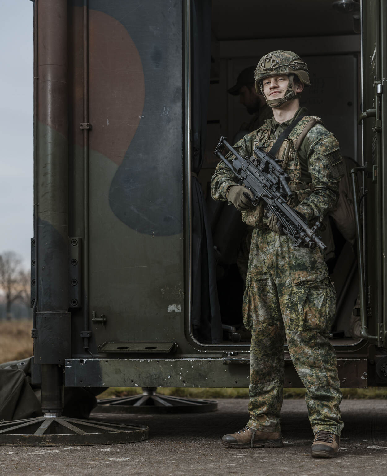 Een militair staat op de hei voor de ingang van een gecamoufleerd militair voertuig.