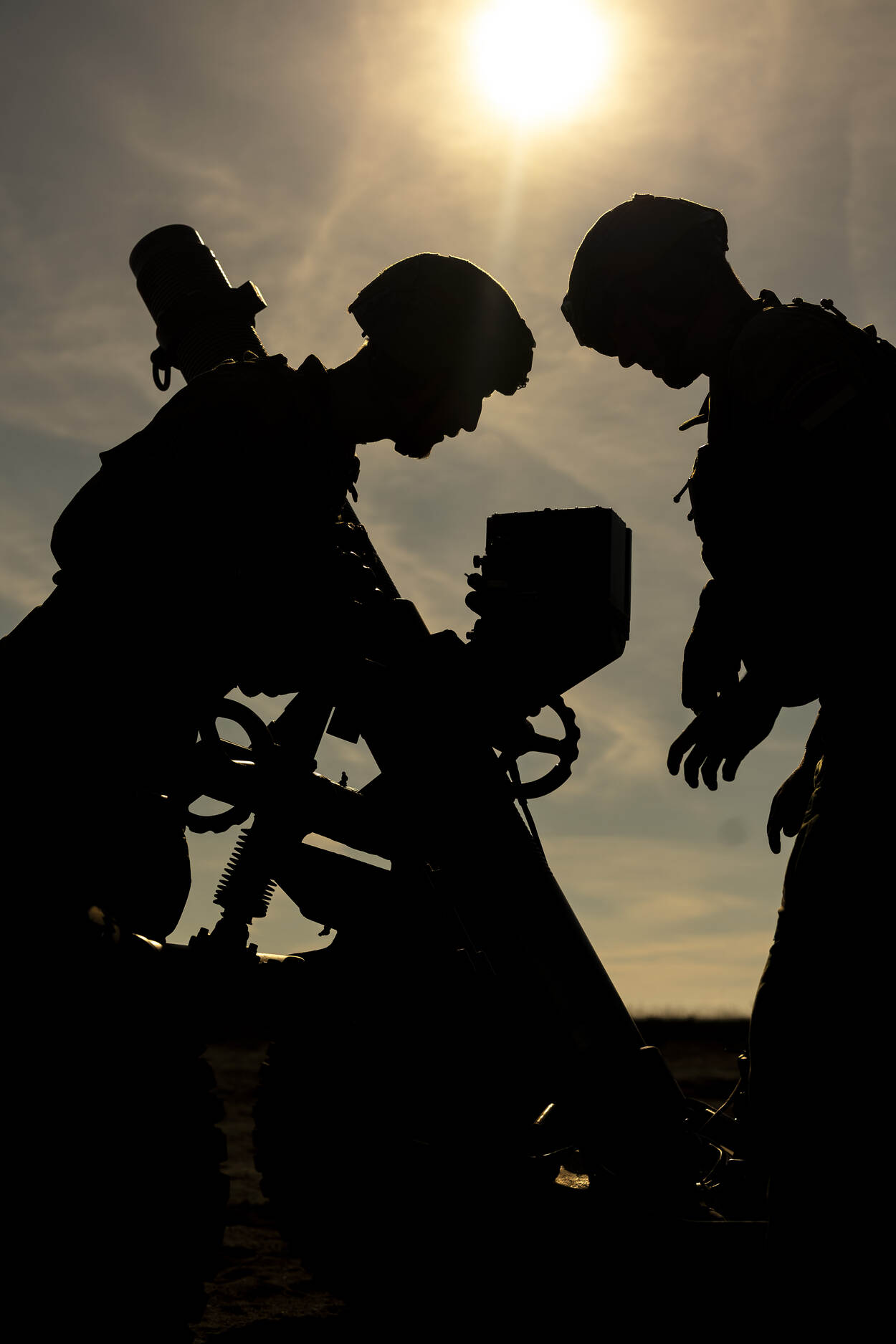 Een silhouet van twee mortieristen.