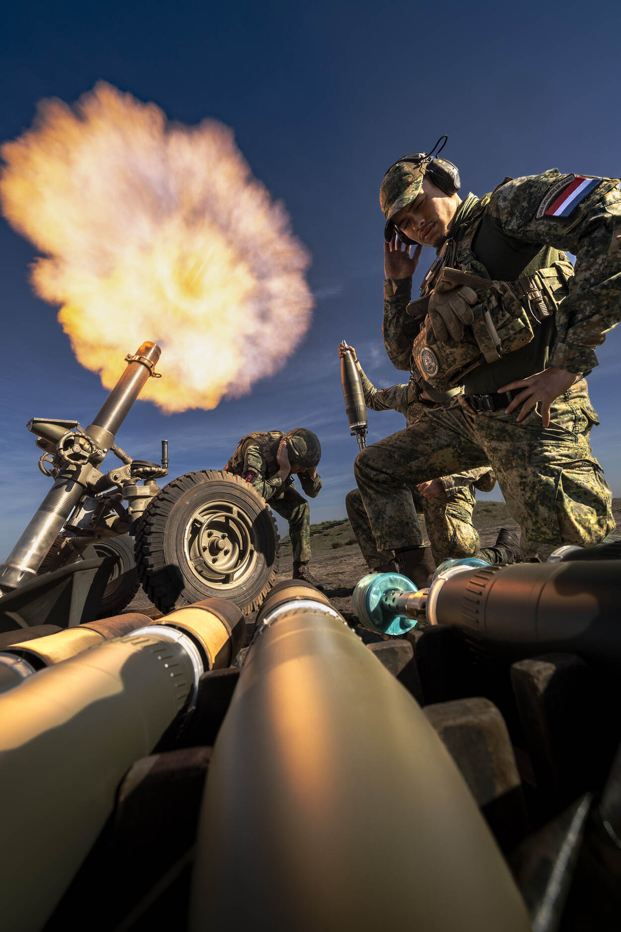 ‘Stuk 2, richting 0695, elevatie 1167!’, klinkt het luid vanuit het FDC. Een korporaal bij de betreffende mortier herhaalt de gegevens en collega’s draaien de standen op het stuk.