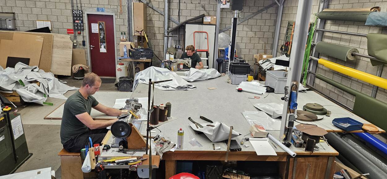 Personeel van 302 Matlogpeloton is druk aan de slag met het productieproces van de koelzeilen.