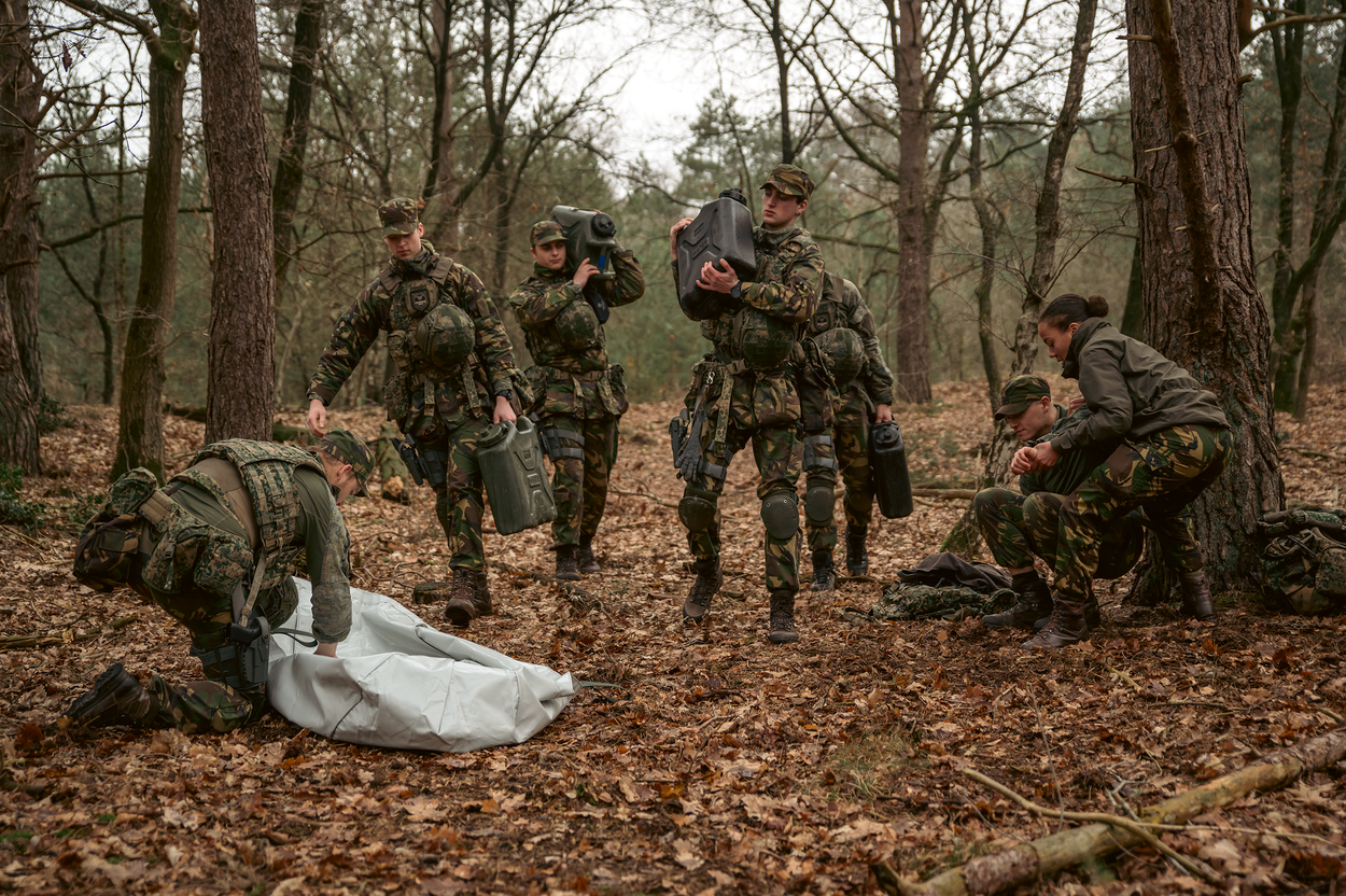 In een opgezet scenario proberen militairen de lichaamstemperatuur van een collega te laten dalen door gebruik te maken van een koelzeil.