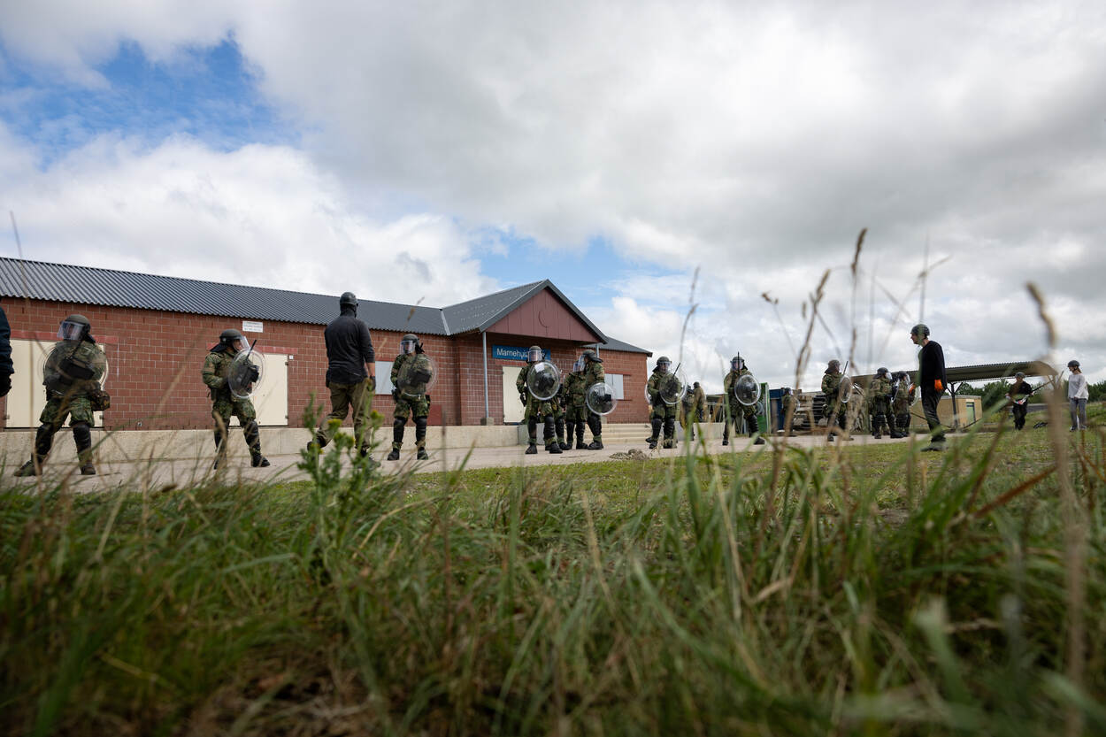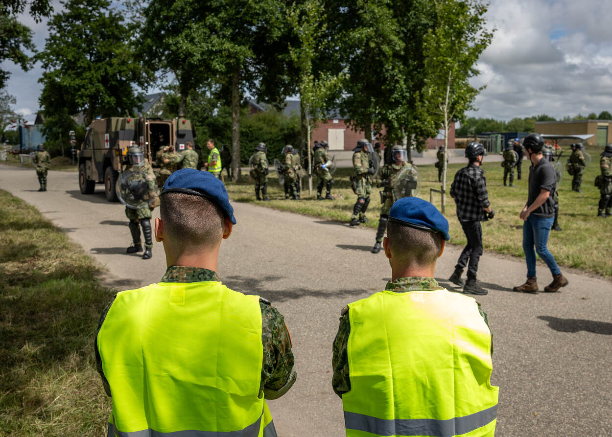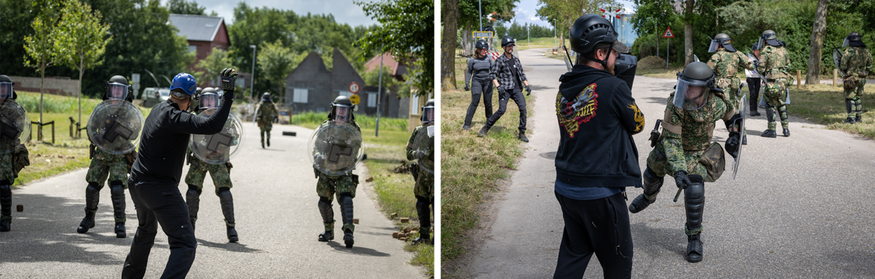 De-escaleren en zo min mogelijk gebruik van geweld, dat is de belangrijkste boodschap. Maar dat zou net te gemakkelijk zijn tijdens de oefening, die behalve in Marnehuizen, ook in Assen (patrouilles) en Havelte (verkenningen) plaats heeft. “Het kinetische deel vindt hier plaats”, waarschuwt compagniescommandant kapitein Bernhard van tevoren. Dus komt er een gesimuleerd vuurgevecht aan te pas, compleet met van pijn schreeuwende gewonden en chaos onder demonstranten. In de middag heeft een agressieve menigte zich verzameld bij een brug, om de militairen van Althea de toegang tot een dorp te ontzeggen. Dan komt de zogenoemde combat riot control met hun beschermingsmiddelen en de lange lat in actie.