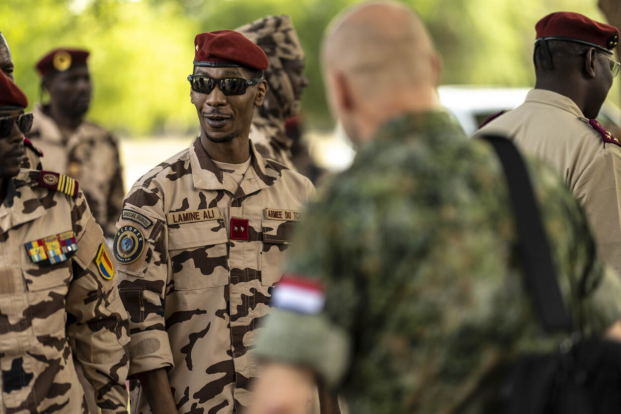 Generaal Lamine Ali is verantwoordelijk voor de Tsjadische troepen die in het buitenland optreden. Regelmatig neemt hij een kijkje op het oefenterrein. “Wat ik erg waardeer aan de Nederlanders is hun manier van lesgeven. Andere landen menen soms beter te weten wat goed voor ons is. Nederlanders nemen echt de tijd om te luisteren naar wat wij nodig hebben.” Een van de dingen die de Tsjadiërs geleerd hebben, is het zelf verzorgen van gewonden. “Als iemand een schotwond heeft, behandelen wij die persoon niet gelijk, maar zoeken we eerst medisch personeel. Maar nu weten we: als er 2 militairen zijn, kan de 1 de ander helpen. Dat kan levens redden.” Daarnaast hebben de Tsjadische militairen veel gehad aan het Optreden Verstedelijkt Gebied (OVG). Zeker als er een inzet komt voor de Verenigde Naties, zo benadrukt de generaal. “In Tsjaad is heel veel woestijn. Wij zijn niet gewend aan OVG. We moeten het echter wel leren, want we weten niet waar de VN ons mogelijk heen stuurt en dan is het belangrijk dat we alle kennis in huis hebben.”