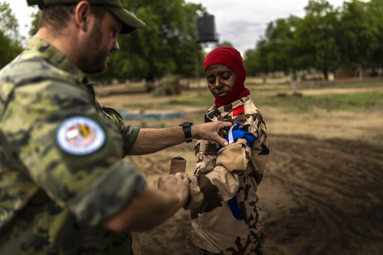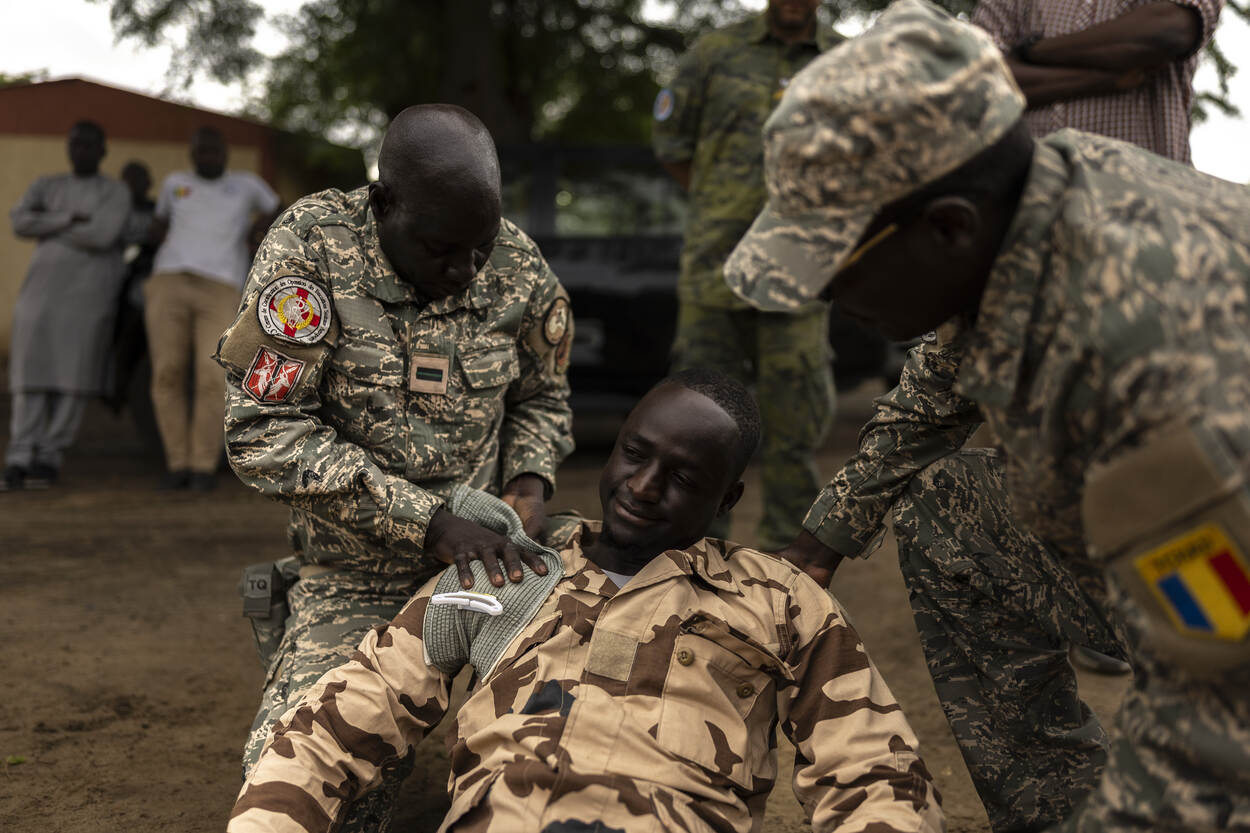 Een Tsjadische militair krijgt een drukverband aangelegd in zijn oksel.
