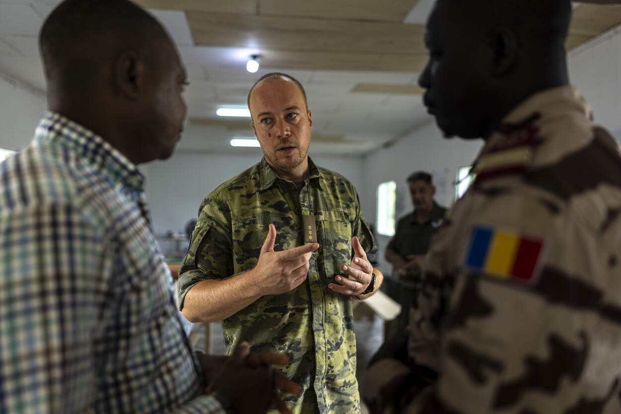 Kapitein Lowieke verzorgt lessen in het staflokaal. Hij is er vanaf het begin van de missie bij en ging er naar eigen zeggen redelijk blanco in. “Wat we vooraf te horen kregen was dat het fysieke en mentale deel goed is, en de gevechtsbereidheid hoog. Maar dat de conceptuele component minder ontwikkeld is. Daar focussen wij hier dan ook op.” Voordat de officier met zijn Tsjadische collega’s kon werken, aan bijvoorbeeld het schrijven van een order of de uitvoering van een operatie, lag er een andere uitdaging. Wat wij in Nederland als normaal beschouwen, is in een van de armste landen ter wereld namelijk niet vanzelfsprekend. “In het Nederlandse onderwijs leer je veters strikken, matrixen lezen, omgaan met tijd; dat is hier echter niet standaard. Hier kan dus bijvoorbeeld niet iedere militair zwemmen. Dat betekent dat je een ander startpunt hebt voor je training en dat je moet afwegen hoe je het meest effectief je opdracht behaalt.”