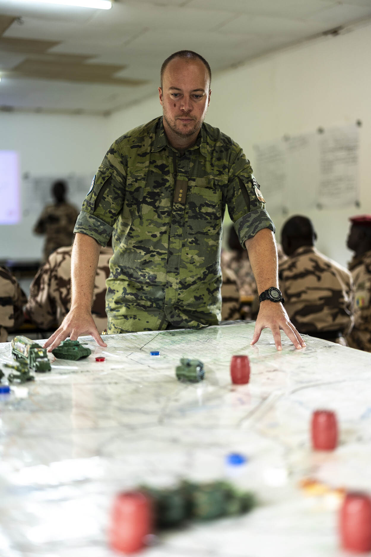 Kapitein Lowieke in het staflokaal. Achter hem geeft een Tsjadische instructeur zijn collega’s les.
