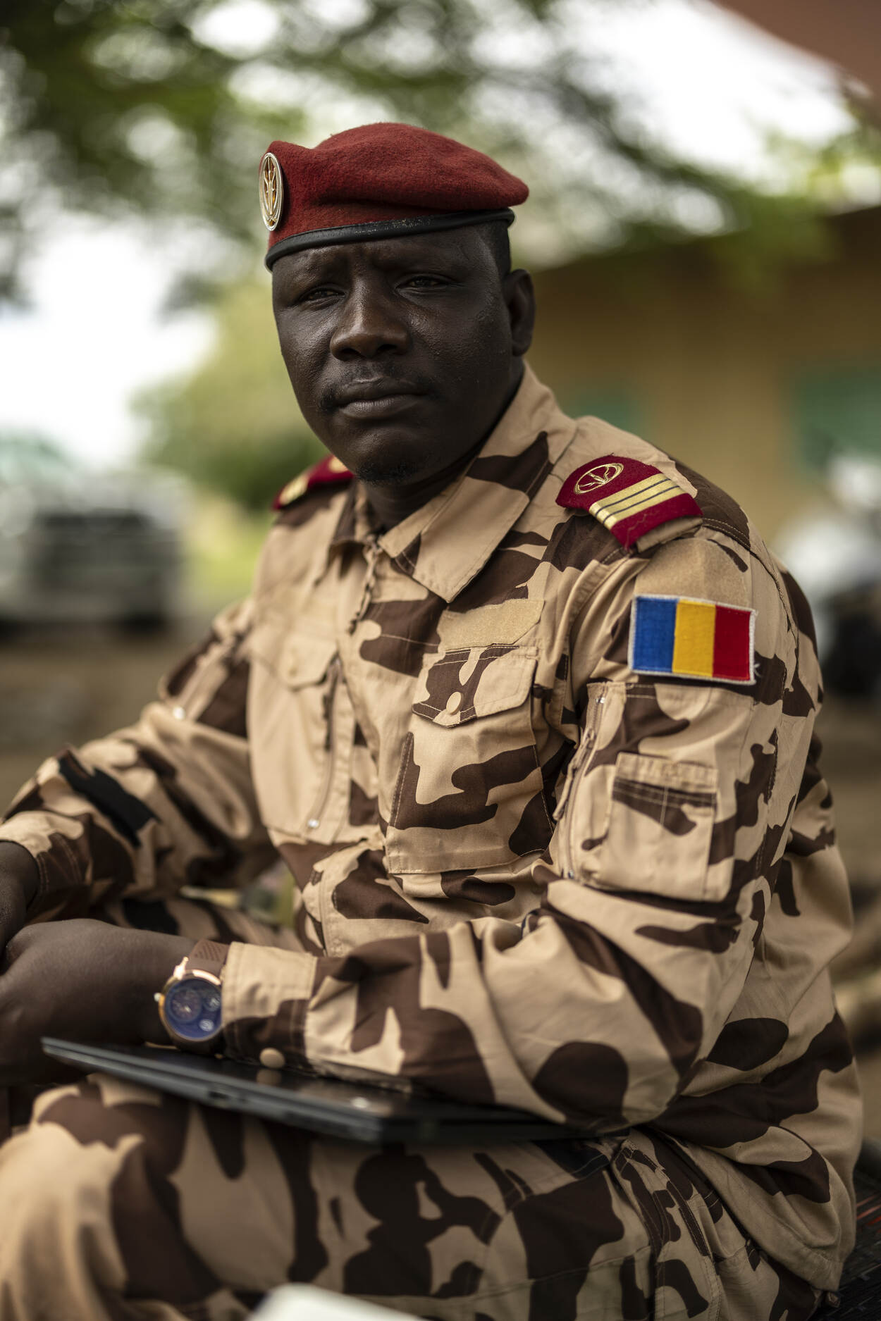 Het regent in N’Djamena en niet zo’n beetje ook. Grote, donkere wolken pakken zich samen boven de hoofdstad van Tsjaad. Voor de Tsjadische militairen volgt een zware nacht, zo is ook de volgende ochtend te zien op het oefenterrein. De bosjes hangen vol met natte kleding en dekens liggen uitgespreid in het gras. Ook de toegangsweg is getroffen door fikse buien. Grote plassen zorgen ervoor dat chauffeurs al zigzaggend het terrein op komen. Tussen de lesgebouwen vormen zich kleine slootjes. De Tsjadische militairen laten zich er niet door uit het veld slaan. Als het ochtendappel is afgelopen, splitsen ze zich op in kleine groepjes om elk naar een hoek van het oefenterrein te lopen waar de lessen plaatsvinden.