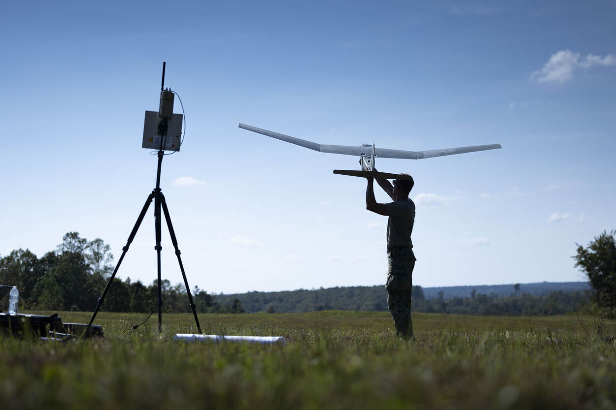 Een militair lanceert een drone vanuit de hand