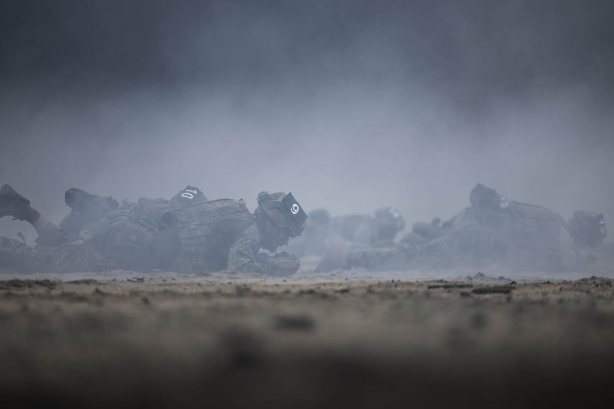 drie kruipende militairen op de baan met op de achtergrond een tribune met toekijkende militairen.