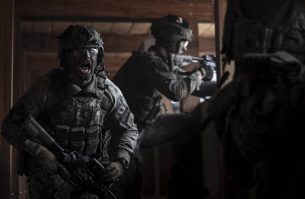 een schreeuwende militair in de bunker.
