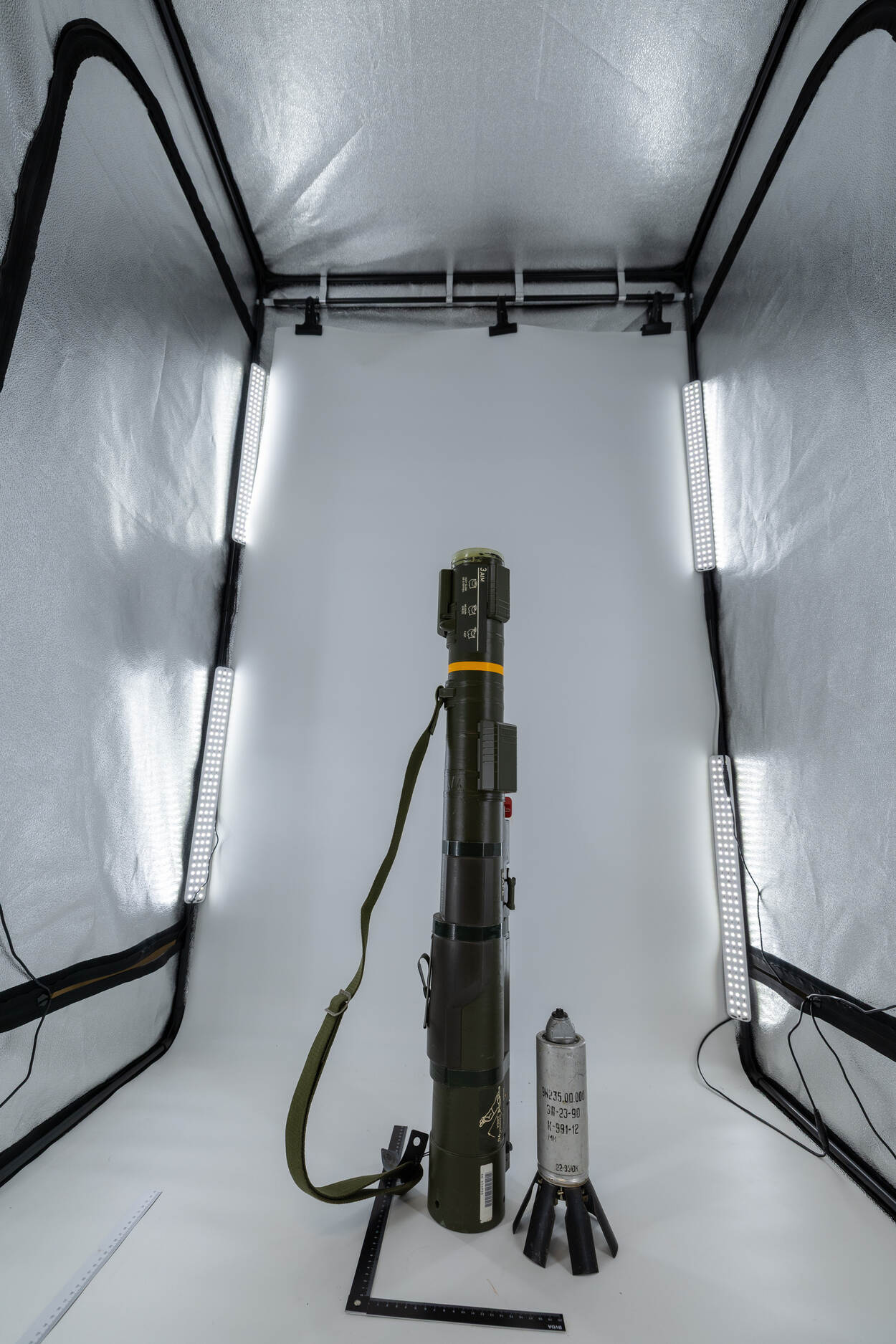 De fotostudio in de werkplaats, met daarin een wapensysteem en een munitieartikel.