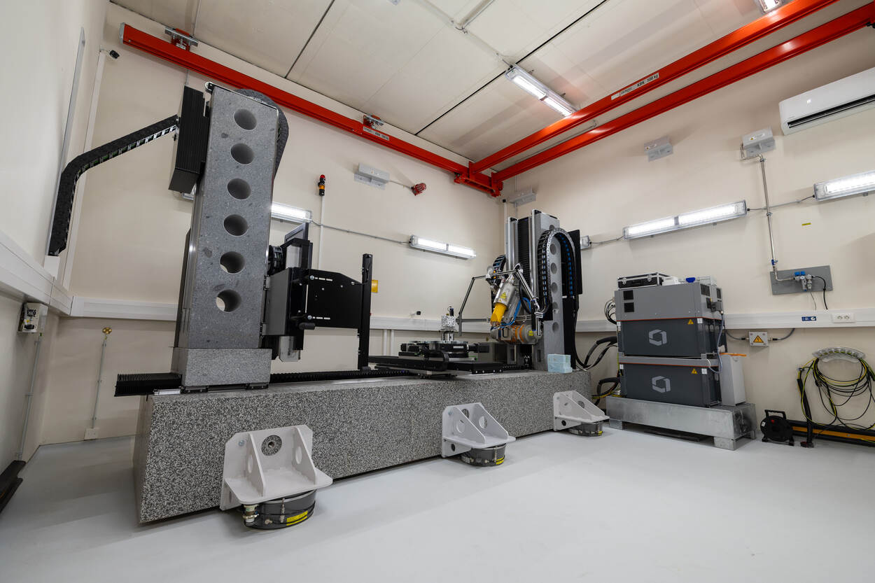 Dit geavanceerde röntgenapparaat weegt 16 ton. Tijdens de bouw van de werkplaats moest er een 300-tons kraan aan te pas komen om deze gigant binnen de muren van het complex te tillen.