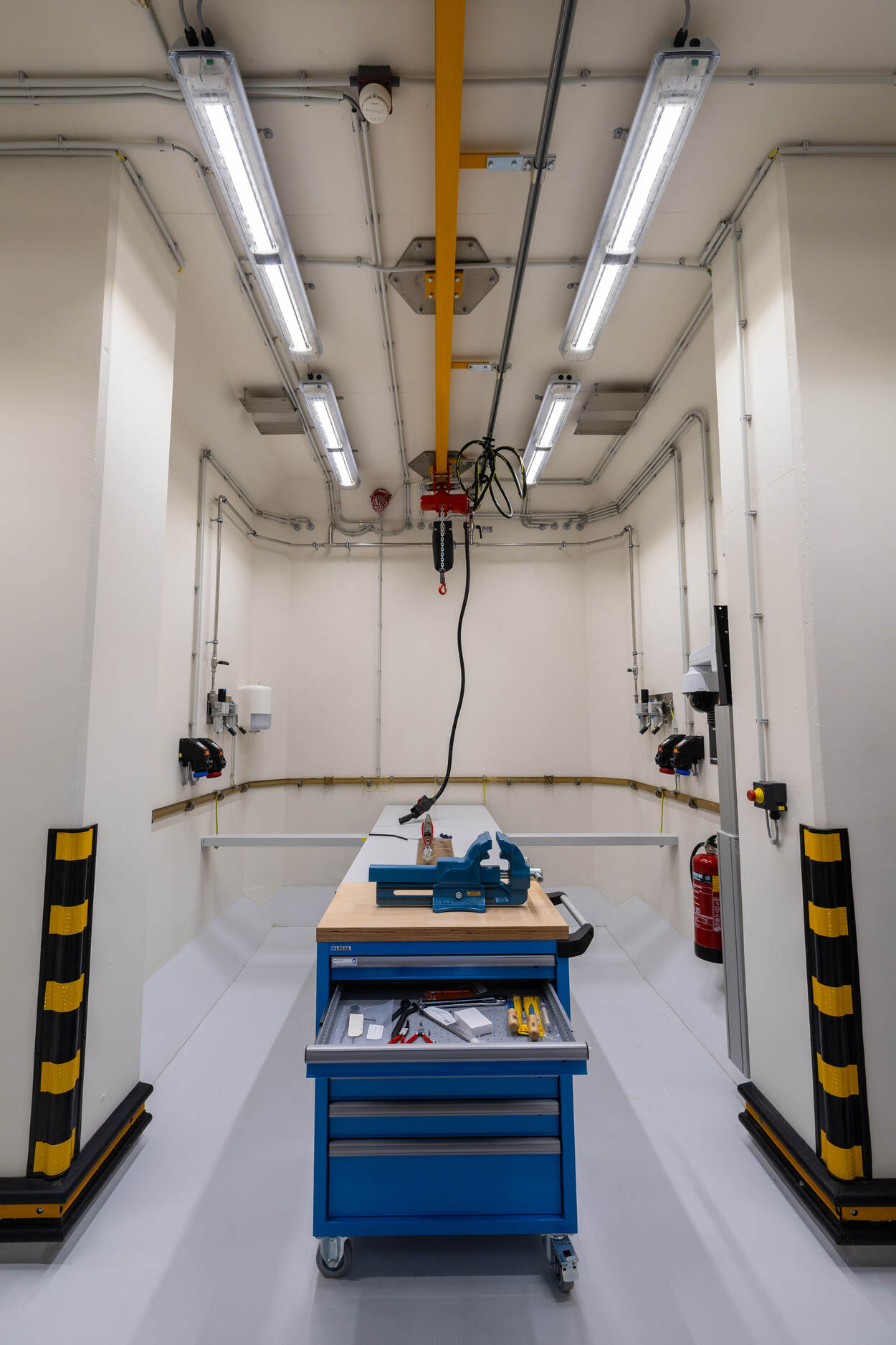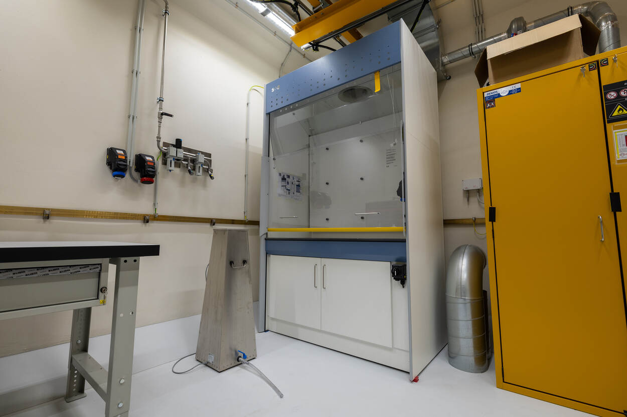De zuurkastruimte heeft extra signalering om gevaarlijke dampen te detecteren als de afzuiging uitvalt.