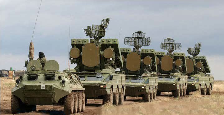 Een luchtverdedigingsbatterij tijdens een mars. Desondanks houden de Russen veelal de hand op de knip als het gaat om de luchtmacht.