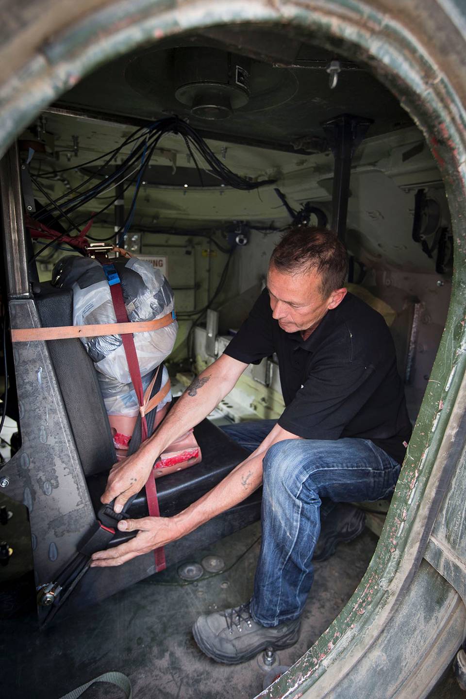 “Deze af te stoten YPR is representant van een bepaalde klasse pantservoertuigen en daardoor geschikt voor onze testen”, legt de projectleider uit. Het afgeschreven materieel krijgt zo dus een laatste missie. Plaats van deze militaire botsproef is een speciaal hiervoor ingericht deel van het Artillerie Schietkamp in ’t Harde. De proefnemers plaatsen het pantservoertuig bovenop enkele kilo’s springstof. Camera’s en sensoren in, op en rondom de YPR registreren alles. Waardevolle beelden en gegevens, benadrukt Bakker. “We willen weten wat er nou precies gebeurt in een voertuig als het op een mijn of bermbom stuit. Deze proef is voor ons een nulmeting.”