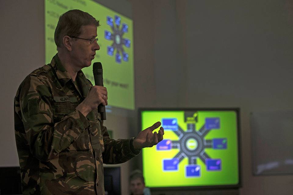 Foto 1: Majoor Marco Hulleman: “Door via de Informatierotonde systemen te laten samenwerken, komt er een wereld van mogelijkheden beschikbaar om te trainen en operaties uit te voeren. Simulatie kan veel bijdragen aan een betere training, planning, uitvoering en evaluatie.”