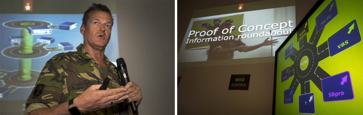 Maar de mogelijkheid om totaal verschillende systemen te integreren bestaat nu wel, bleek begin maart tijdens een demonstratie op de Bernhardkazerne. Daar toonden majoor Marco Hulleman, hoofd Research & Development van het Simulatiecentrum Landoptreden,  en zijn team de werkbaarheid van software met de naam Informatierotonde. Daarbij zijn simulatoren en systemen als ELIAS, het Mobile Combat Training Centre en AFSIS (artillerie) aan elkaar gekoppeld.