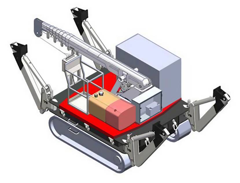 De kraan is opvouwbaar en past dan in een 20-voet container. Een C-130 Hercules heeft daarmee geen enkele moeite. Het bouwwerktuig heeft een rupsonderstel en kan 10 ton tot op 3 meter hoogte hijsen.