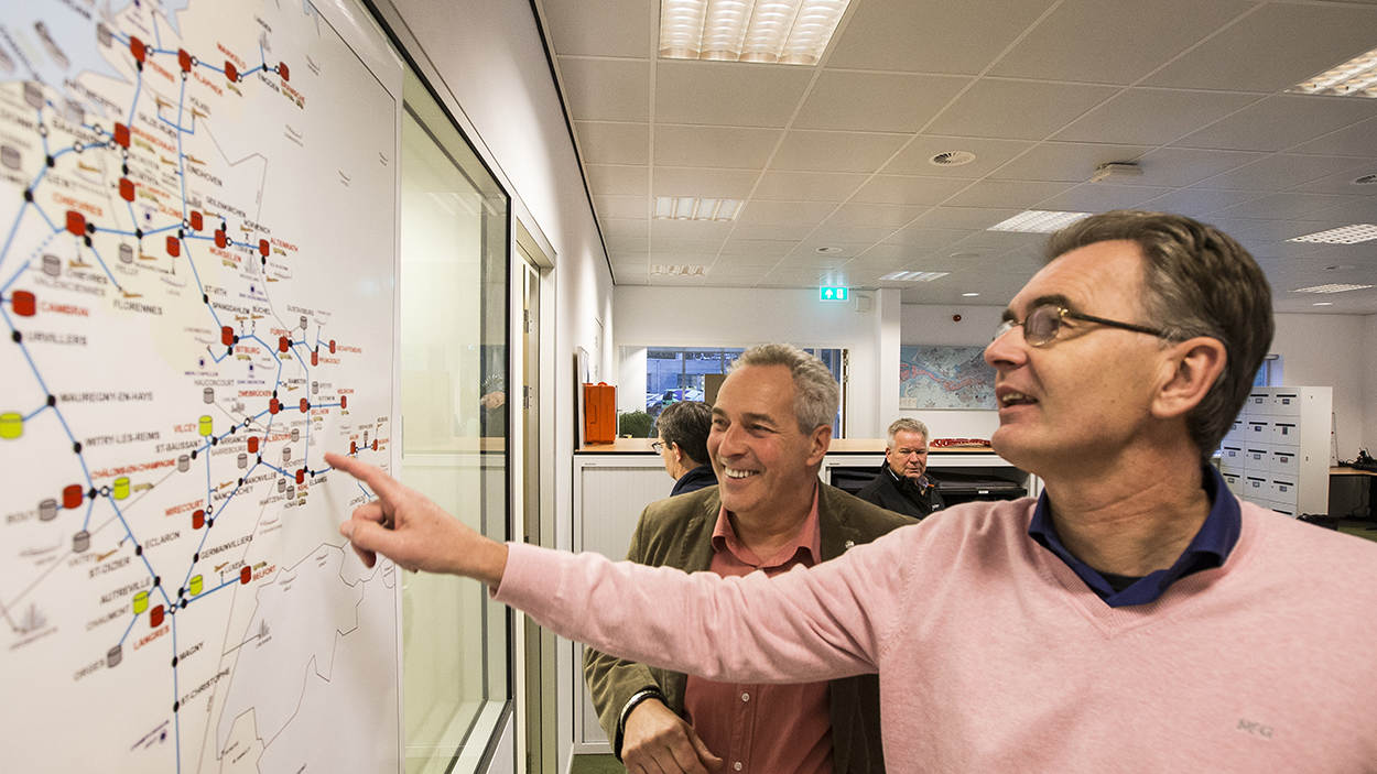 DPO-directeur Olaf Moll wijst zijn collega aan waar de deels ondergrondse pijpleidingen in Nederland liggen.