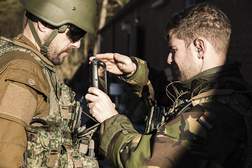 Omdat niet alleen de landmacht het smartvest krijgt, keek ook een afvaardiging van het Korps Mariniers mee. “Het is wel handig om te weten wat de spullen doen bij strenge vorst, op het ijs en in zout water”, zegt de observator namens de mariniers.