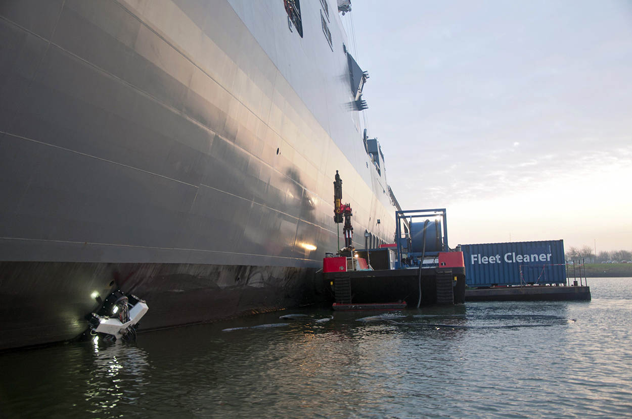 De robot zelf mag dan qua omvang bijna wegvallen tegen het grootste schip van de Koninklijke Marine, er waren niet minder dan 4 zeecontainers nodig om alles te laten werken. Het gehele systeem was geplaatst op een werkschip van de dienstverlener, Koninklijke Oosterhof Holman. Rijkswaterstaat heeft de reinigingsinstallatie gecertificeerd om schepen in alle Nederlandse havens te reinigen. “Het doel van de proef was de cijfers van Fleet Cleaner controleren”, vertelt Molenaar. “De onderwaterromp van een 250 meter lang schip kan volgens het bedrijf binnen ongeveer 12 uur gereinigd worden, zonder de antifouling coating te beschadigen.