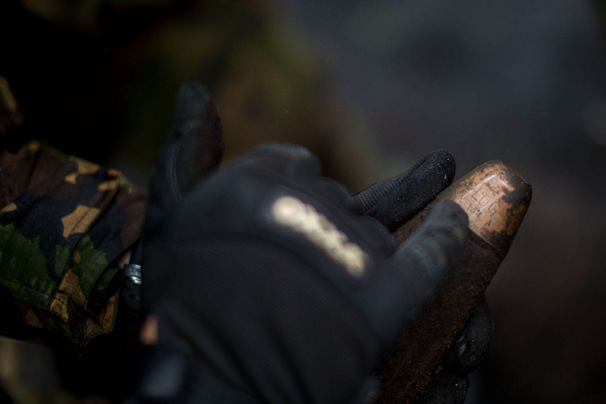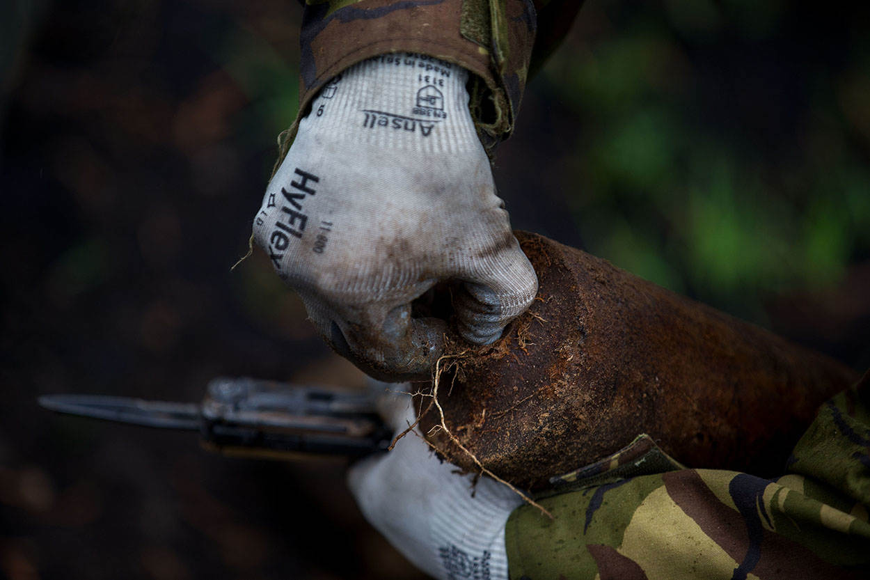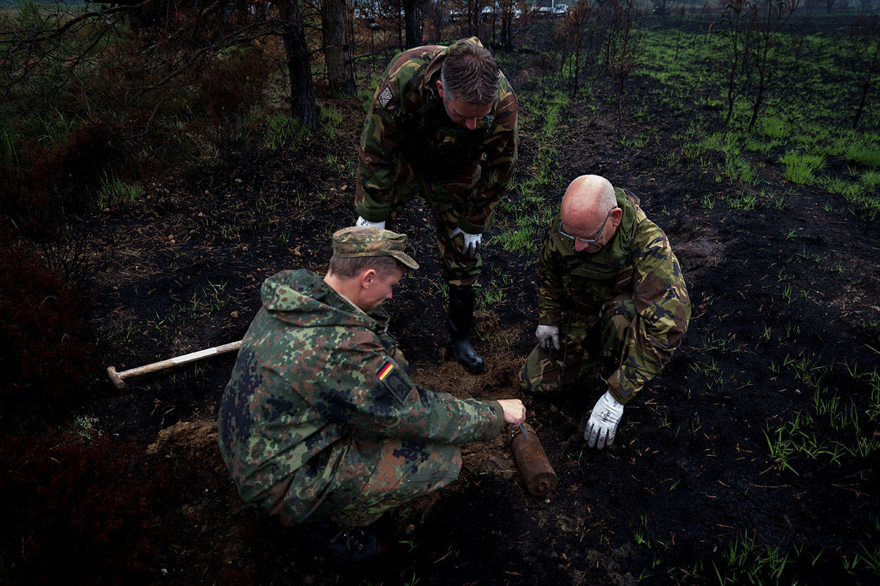 Als een kind in een snoepwinkel loopt sergeant-majoor Berthold Pilat - uiterst behoedzaam - van de ene naar de andere kant over de zwartgeblakerde schietbaan 5A op Bergen-Hohne. “Kijk hier”, zegt hij met een 7.92 patroonhuls in de hand. “Deze is afgevuurd door een Mauser K98k, het geweer van de Wehrmacht. Zal rond 1936 zijn geweest.” Met zijn 5 collega's van het Defensie Munitiebedrijf (DMunB) en de Duitse Fuerwerkers zoekt hij het oefenterrein af naar blindgangers en restanten van munitie.