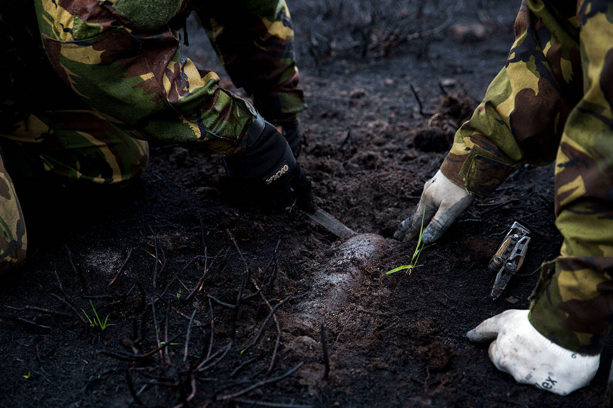 Het is er eerlijk gezegd niet de beste dag voor. Om zeven uur begint het Duits-Nederlandse ‘zoekteam’ in lichte motregen met de werkzaamheden, om 10 uur komt de neerslag horizontaal voorbij en dat duurt de rest van de dag. Het veld verandert in een zwarte brij. Enkele weken daarvoor heeft er brand gewoed, maar dat bevalt de technici juist wel. “Het is heel gemakkelijk vinden zo”, bevestigt sergeant-majoor Peter Karmelk van onder zijn capuchon. Met 6 Nederlandse en een peloton Duitse (burger)medewerkers is het zoeken naar iets bijzonders. “Het is net vissen”, vindt adjudant Wim Nederhoff, “je weet nooit wat je omhoog haalt. Dat maakt het spannend, zeker hier.”