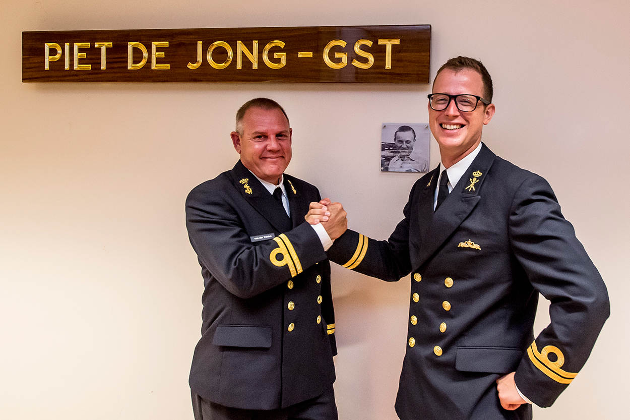 “Piet de Jong en de bemanning hadden helemaal nog niet getraind en de O24 was nog niet eens af, toen ze naar Engeland wisten te ontkomen in de meidagen van 1940”, haakt historicus en De Jong-biograaf Jan-Willem Brouwer aan, bij de opening van de trainer. Hij noemde het ‘terecht’ dat er bij de Onderzeedienst nu een postuum eerbetoon is aan deze kleine commandant. De GST is namelijk vernoemd naar deze oud-minister van Defensie, oud-premier, maar vooral ook oud-onderzeebootcommandant P.J.S. de Jong (1915-2016). Kinderen en kleinkinderen van De Jong waren aanwezig bij de opening en de onthulling van het naambord in gebouw Zeearend.