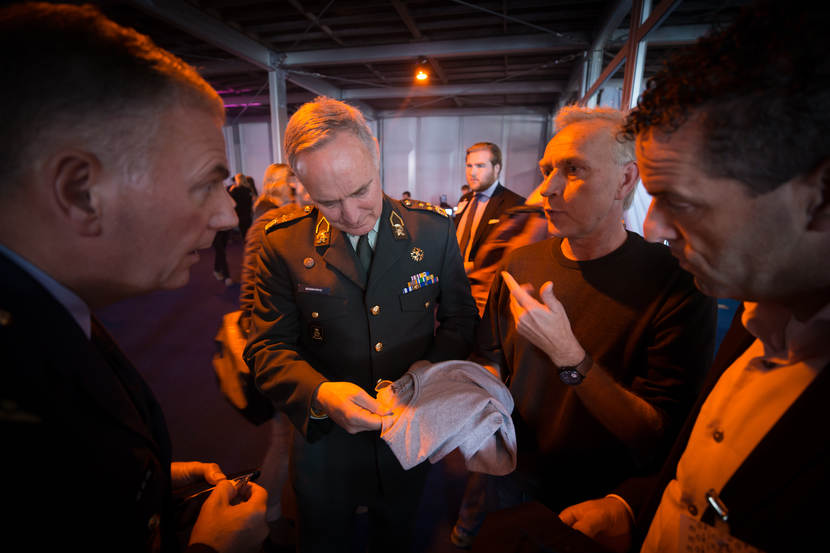 Generaal Middendorp test het t-shirt, rechts van hem ontwerper Rien Otto van Dutch aWEARness.
