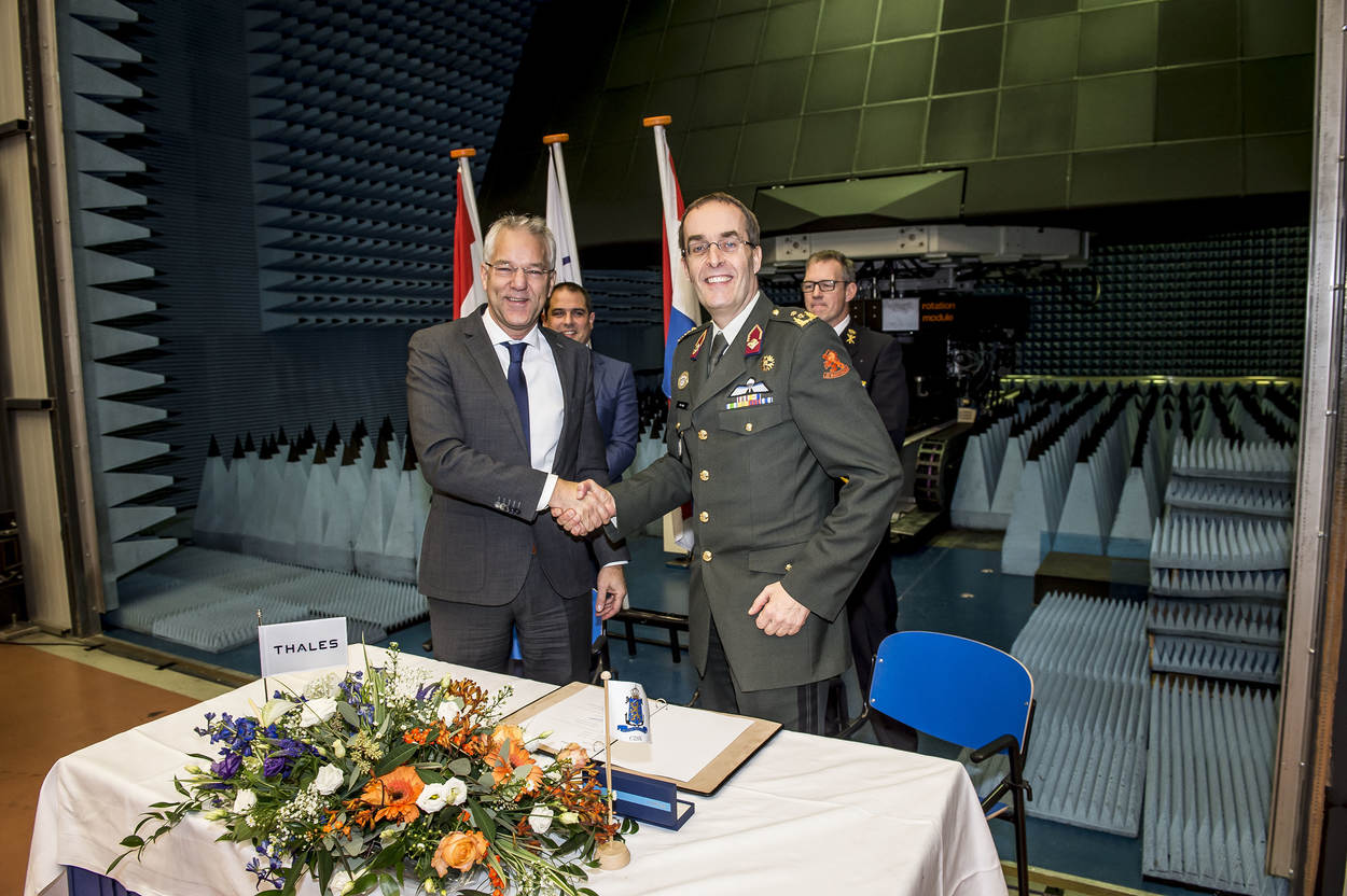 V.l.n.r. kapitein-luitenant ter zee Bert Helder, generaal-majoor Ivo de Jong, projectmanager Armando Spinosa van Thales en Geert van der Molen van Thales. Het eerste exemplaar van de SMART-L ELR staat bij Directie Materiële Instandhouding in Den Helder. Plaatsvervangend directeur DMO generaal-majoor Ivo de Jong tekent namens Defensie; Geert van der Molen, verantwoordelijk voor marinezaken, voor Thales.