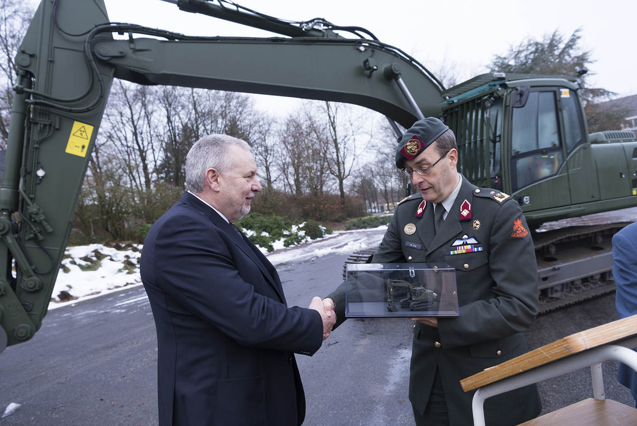 Met een miniatuurgraafrupsmachine draagt fabrikant SMT het nieuwe voertuig over de plaatsvervangend directeur van de Defensie Materieel Organisatie, generaal-majoor Ivo de Jong.
