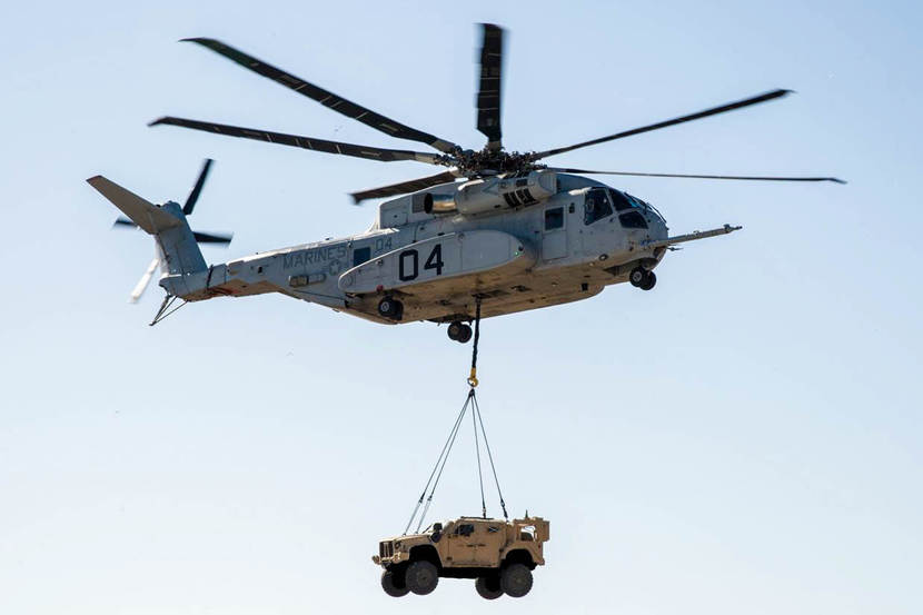The CH-53K is een enorme krachtpatser. In januari vloog de helikopter 10 minuten met een Joint Light Tactical Vehicle – gewicht ongeveer 7.500 kilo - op een hoogte van 35 meter (foto: Lockheed Martin)