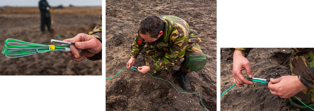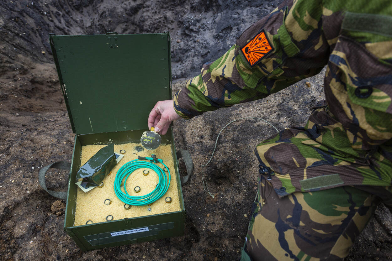 Adjudant Hans Simons brengt de springstof aan, in de kist zijn de handgranaten bedekt met schilfertrotyl. De kisten worden vervolgens in een kuil geplaatst.