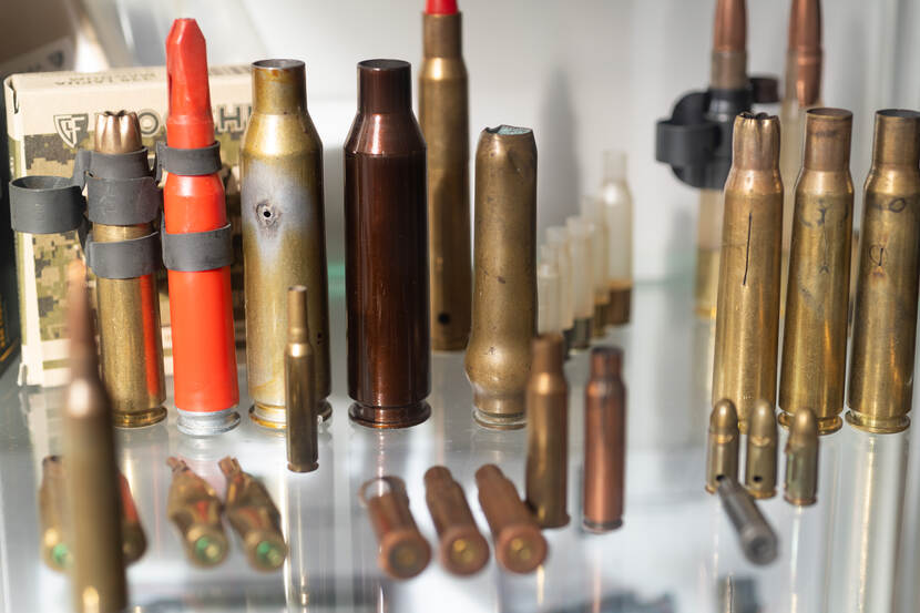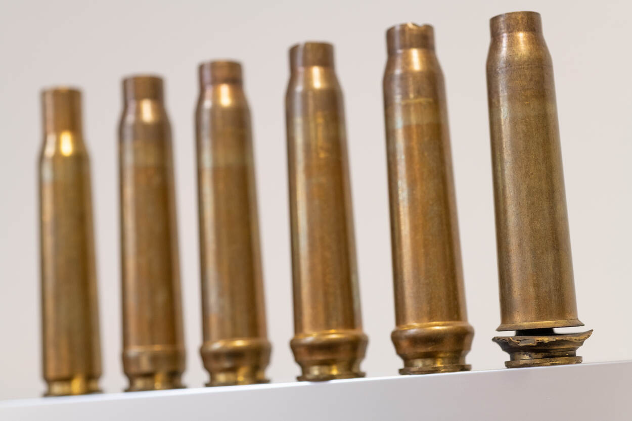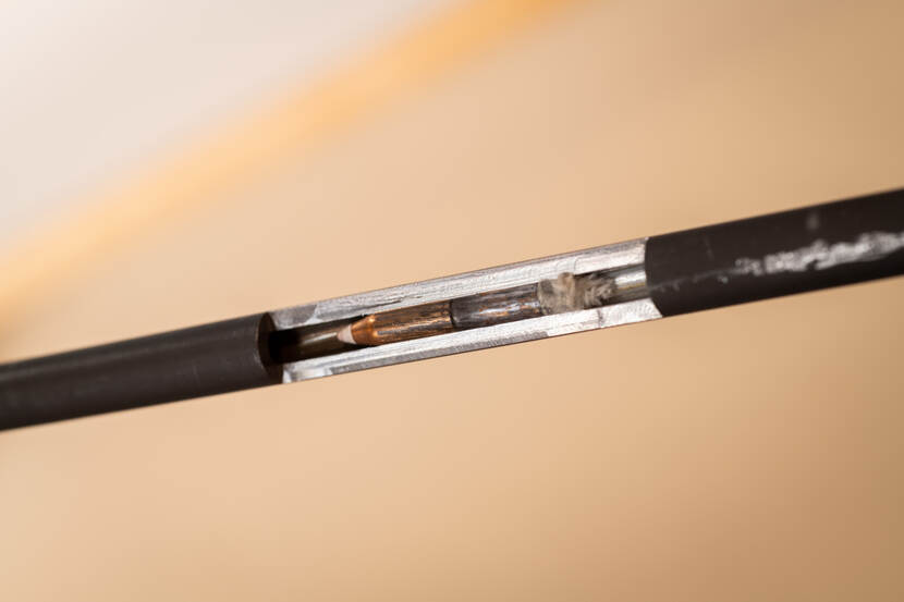 Loopobstructie van 2 achter elkaar afgevuurde patronen in een 5.7 mm FN P90 pistoolmitrailleur. Aldo is gebrand op het opsporen van afwijkingen aan wapens en munitie.
