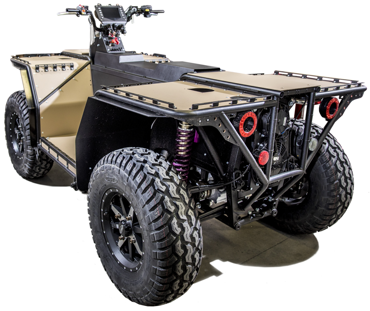 De quad ziet er ruig uit door de mix van staal en aluminium. Ook het formaat helpt daarbij, met afmetingen van 1,5 meter breed en 2,5 meter lang. De quad weegt 745 kilo en kan een ballast van 400 kilo meezeulen. Topsnelheid: 100 kilometer per uur.