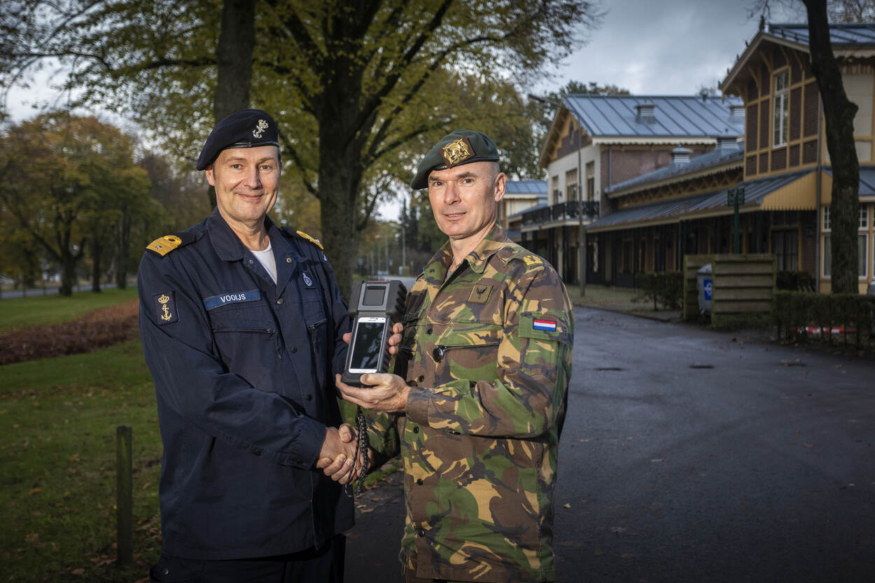DMO/JIVC heeft deze oefening gebruikt om, in nauwe samenwerking met de leverancier, de middelen te gebruiken en zo al lerend en doende de configuratiefase te doorlopen. Biometrie is een project van het JIVC dat valt onder het programma Counter-IED Blok 3 van het Materieel-logistiek Commando. Commandeur Cees Vooijs, plaatsvervangend-directeur JIVC, gaf namens de DMO de aftrap van de implementatiefase. Hij droeg de eerste handheld symbolisch over te aan brigadegeneraal Joland Dubbeldam van het Commando Landstrijdkrachten (foto).