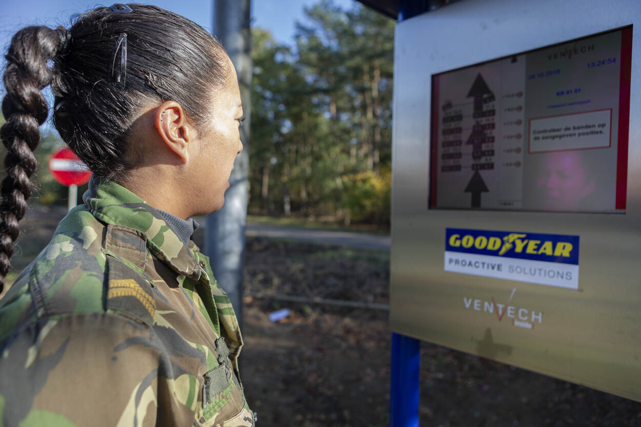 Korporaal-1 Tessa Hardin, chauffeur bij 140 Zwaar Transportcompagnie, toont zich – na enkele proefrondjes - gecharmeerd van het systeem. “Het bespaart zeker tijd als je niet meer handmatig alle banden hoeft na te lopen, dit werkt een stuk makkelijker! Wel zou het fijn zijn als je ter plekke lucht kunt bijvullen, dan hoef je niet meer langs de garage waar het altijd druk is. En een paar markeringslijnen in de lengterichting van de sluis zouden het inrijden ook een stuk vereenvoudigen.”