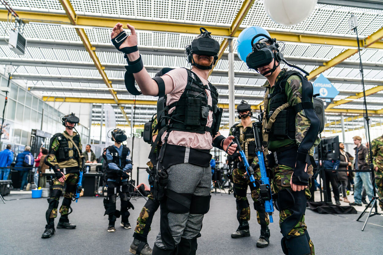 Hét IT-bedrijf van Defensie, het Joint IV Commando, was met andere innovatieve onderdelen van de krijgsmacht prominent aanwezig op Bright Day. Manieren om die op interactieve te demonstreren, waren bijvoorbeeld 3D foodprinting en het virtuele trainingssysteem SUIT (foto onder).