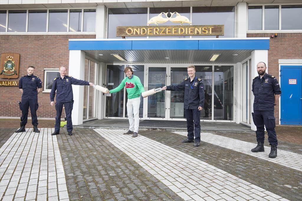 Uit handen van LTZ1 Berend van der Kraats, 1 van de aanjagers van duurzaamheid binnen het marinebedrijf, ontvangen de bemanningen van deelnemers hun flessenpost.