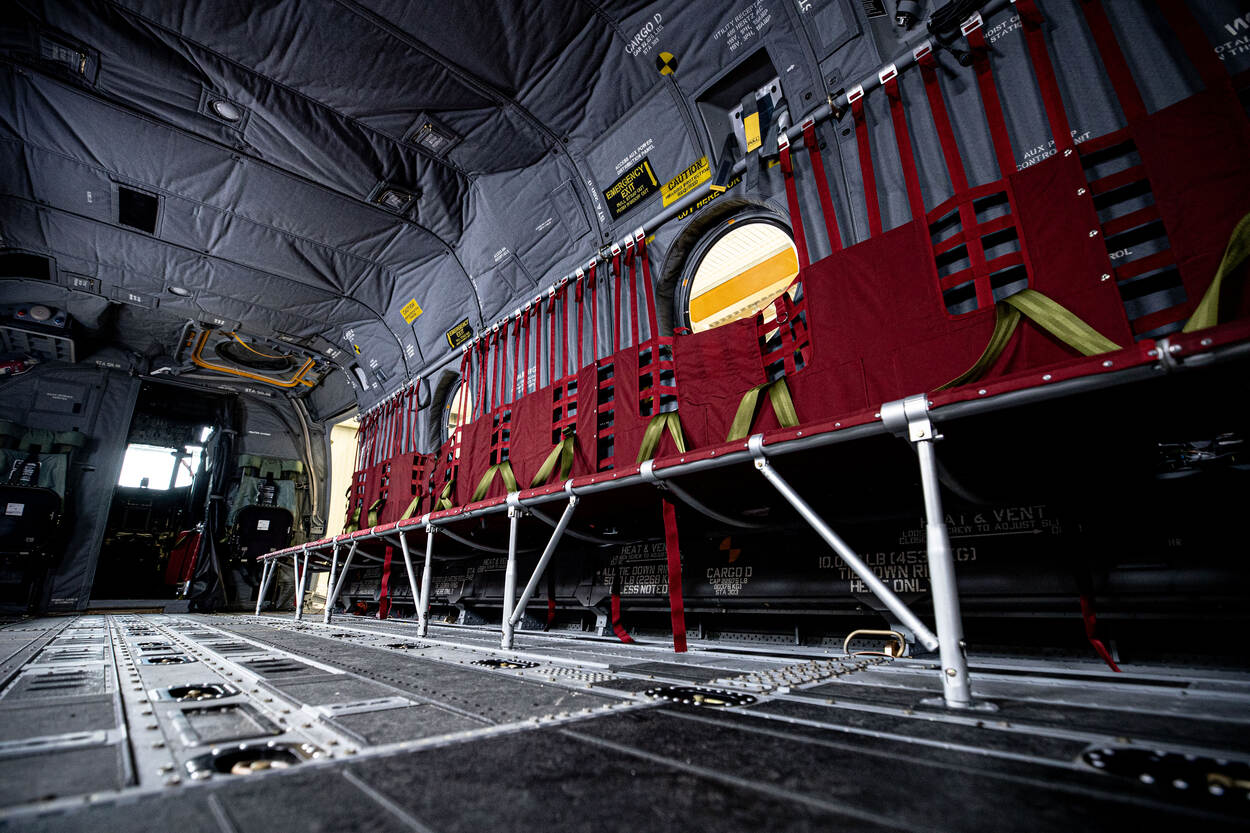 Wie de nieuwe Chinook instapt, ruikt de geur die aan nieuwe schoenen doet denken. Het komt van de geluiddempende acoustic blankets, een grijze stof op de wanden, die ervoor zorgt dat je elkaar tijdens het vliegen beter verstaat. Bovendien verbergen ze alle bedradingen en leidingen: een rustigere aanblik. Alles oogt nieuw: frisse verf en schone vloer. Alleen de afneembare rode ‘hangmatjes’ die dienen als stoelen komen nog uit oude helikopters. De meegeleverde zijn volgens de Nederlandse luchtvaartautoriteit niet brandwerend genoeg, dus doen deze dienst tot de nieuwe robuuste (crash resistant) exemplaren in de zomer arriveren.