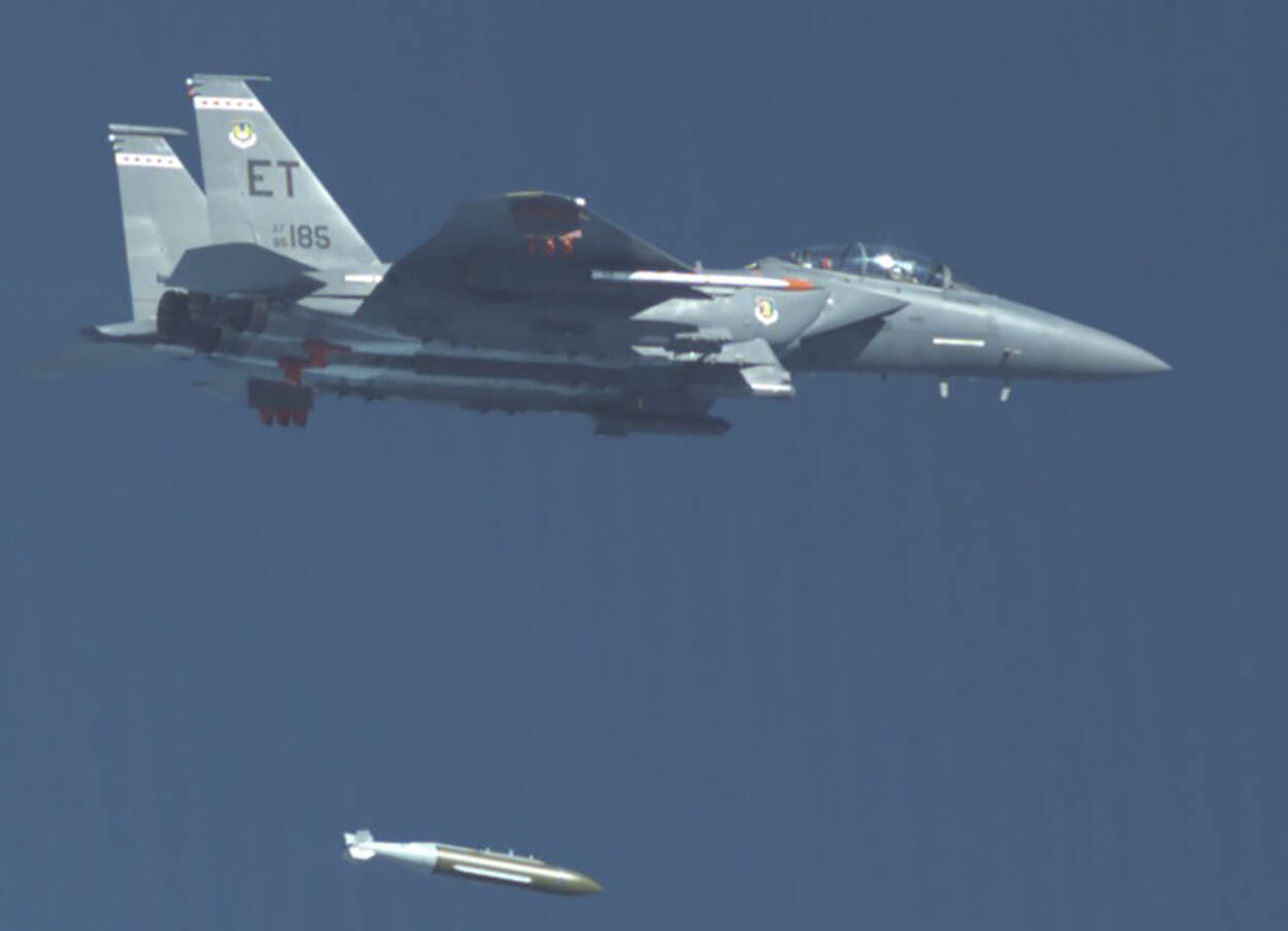 Een F-15E Strike Eagle gevechtsvliegtuig liet vorige week deze GBU-72 Advanced 5K Penetrator-bom vanaf 35.000 voet, ruim 10,5 kilometer, los boven een testinstallatie bij Eglin Air Force Base (Florida). Met succes. Het gaat om een zogenoemde slimme bom (joint-direct-attack-munition, JDAM),  dus GPS-geleid voor de precisie.