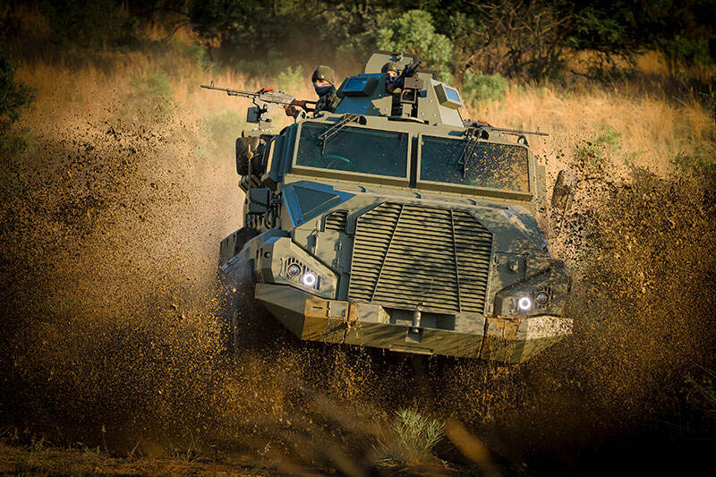 Er zijn verschillende opties beschikbaar als bewapening, die zowel handmatig als elektrisch bediend kan worden. Er zijn 2 punten aan de zijkant beschikbaar voor de bevestigingen van machinegeweren. Verder heeft de Nyati in de infanterieversie 12 zijkleppen om van binnenuit met het persoonlijk wapen te kunnen werken. (foto: Twiga)