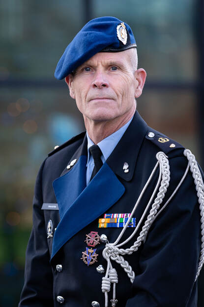 Aangezien hij liefst 41 jaar militair was, moet het afscheid eind december voor de marechaussee-adjudant een ding zijn geweest. Er was echter ook reden tot juichen. En hoe! Directeur DMO vice-admiraal Arie Jan de Waard onderscheidde hem met het Ereteken voor Verdienste. “Daar stond ik met mijn mond vol tanden... Dit had ik nooit verwacht. Ik beschouw de onderscheiding als teken dat ik het als stafadjudant goed heb gedaan.”