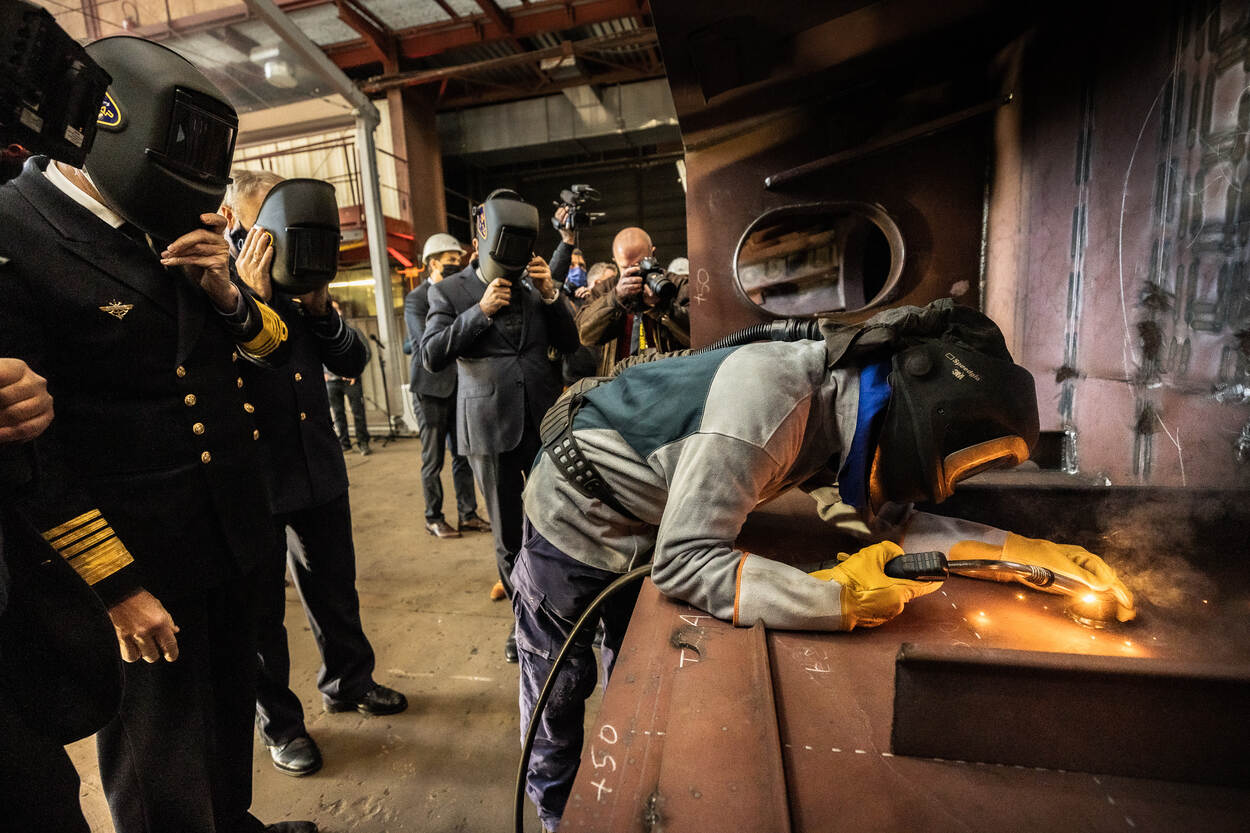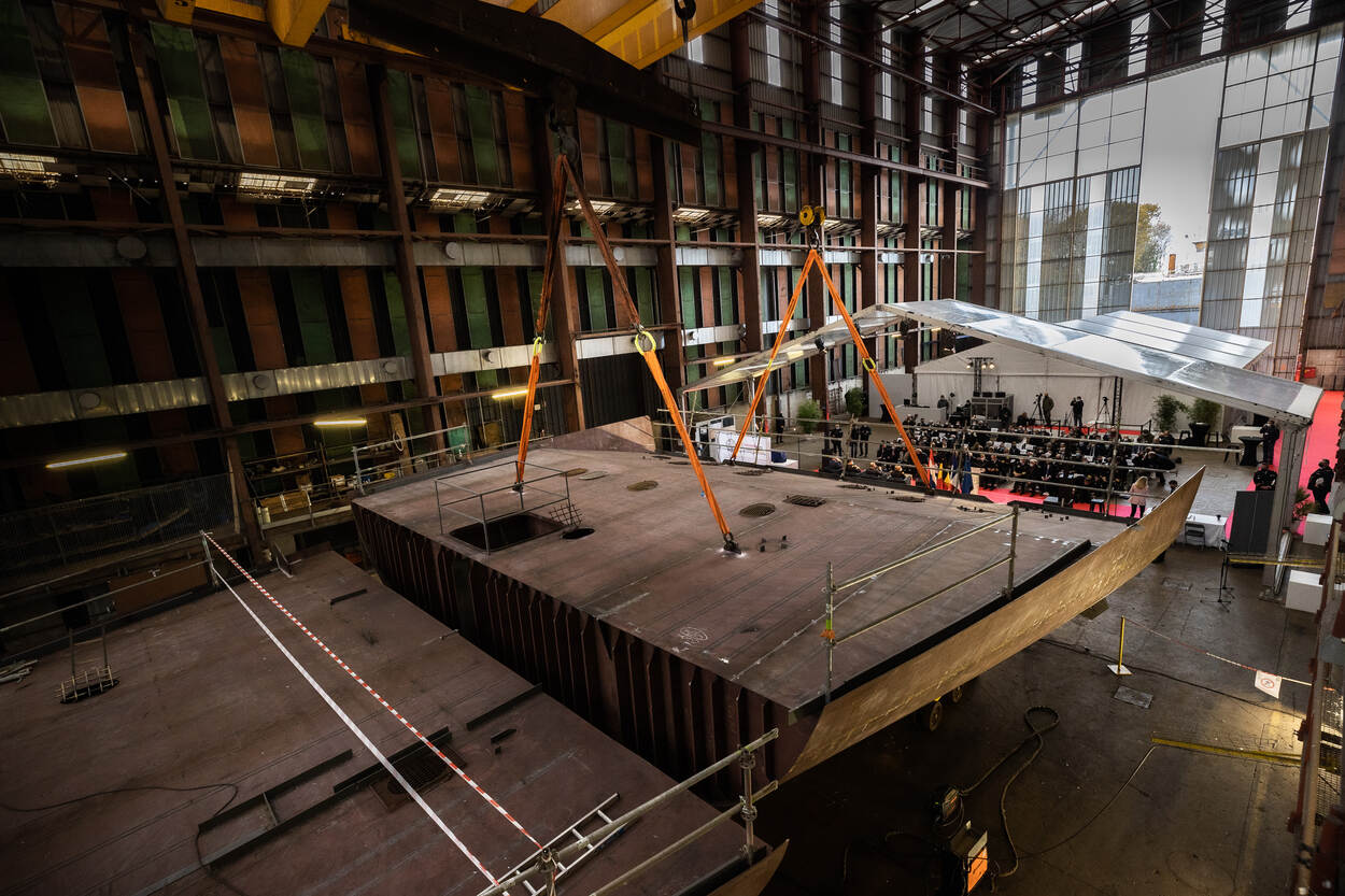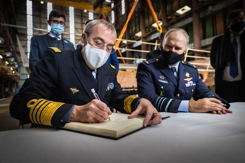 Onder toeziend oog van Commandant der Strijdkrachten generaal Onno Eichelsheim en zijn Belgische ambtsgenoot Chef Defensie admiraal Michel Hofman, werd een herinneringsmunt van de stad Oostende op de bodem van het eerste scheepssegment gelast.