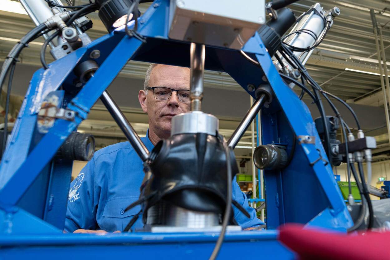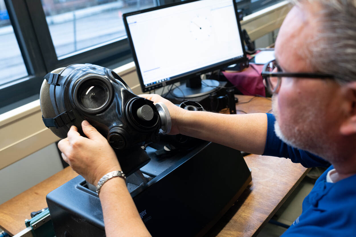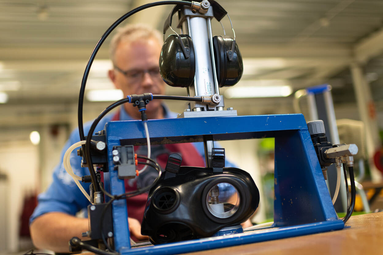 Werkt het nieuwe masker naar behoren? Op het laatste station wordt de luchtdichtheid getest.