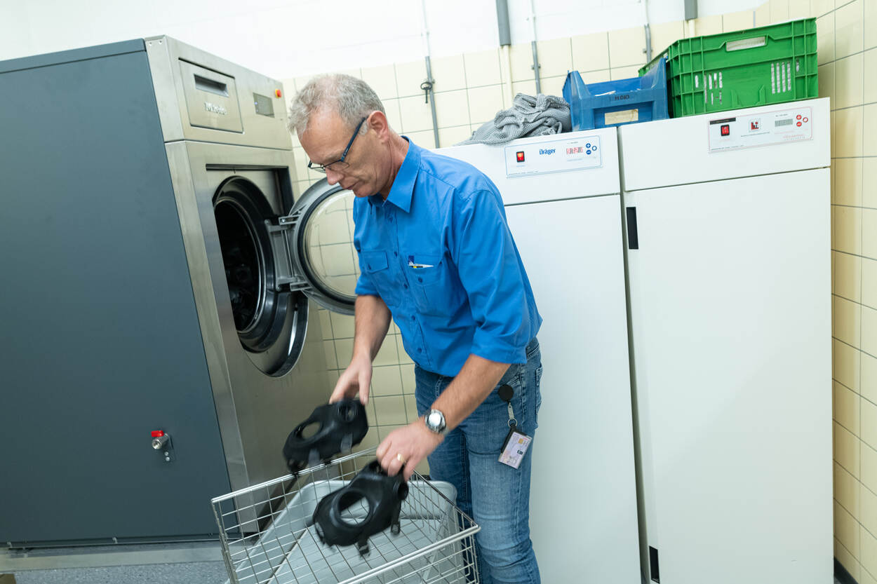 Na een wasbeurt plaatst Bert de maskers in een droogkast waarna ze gedesinfecteerd kunnen worden opgebouwd.